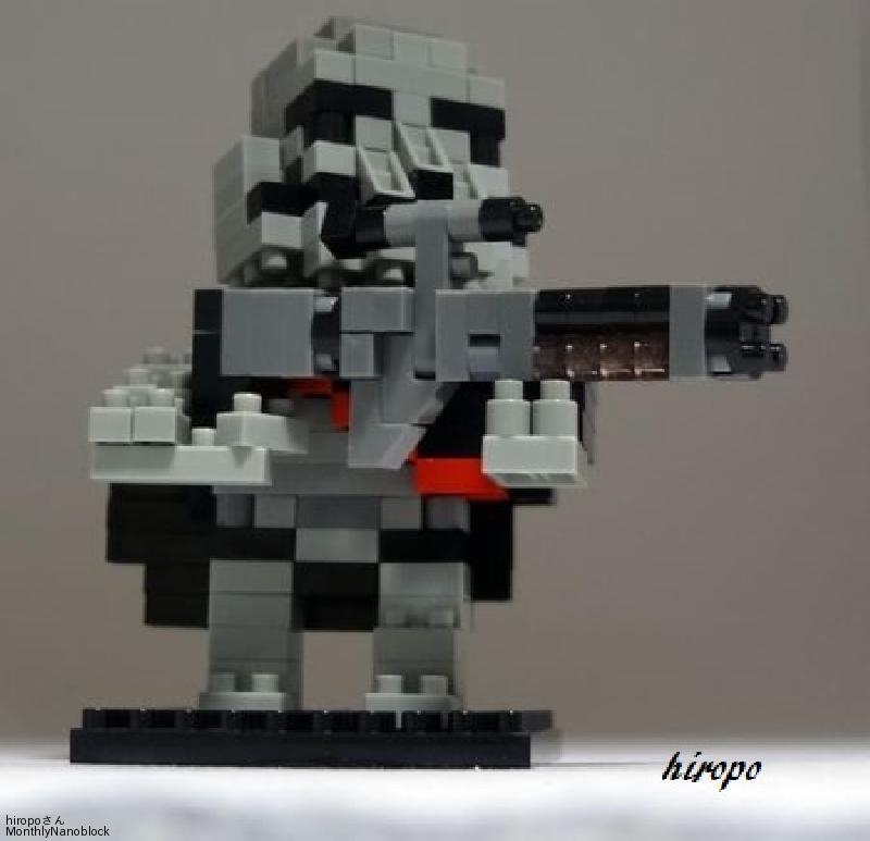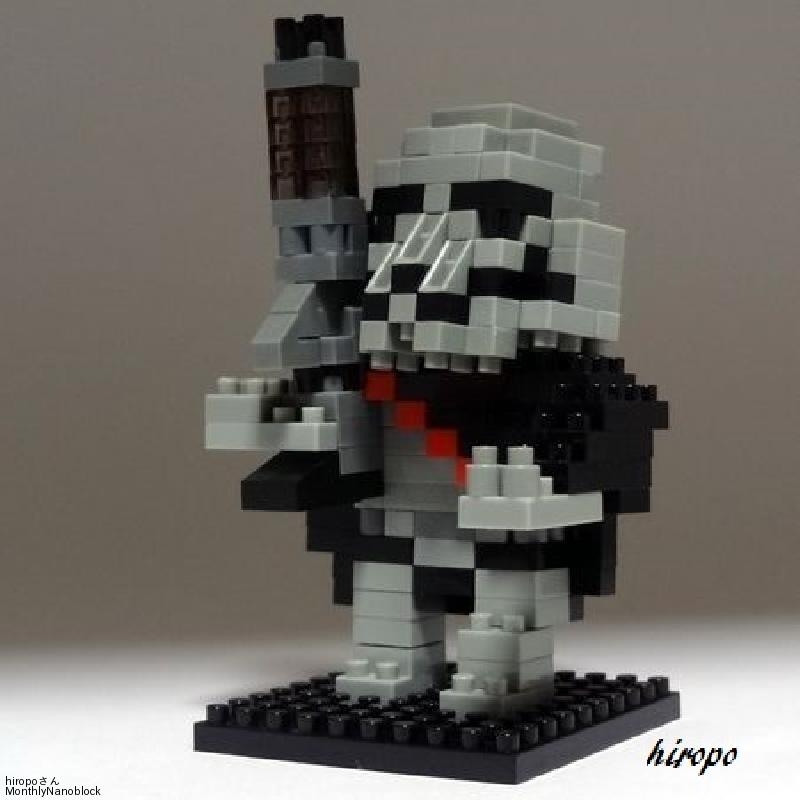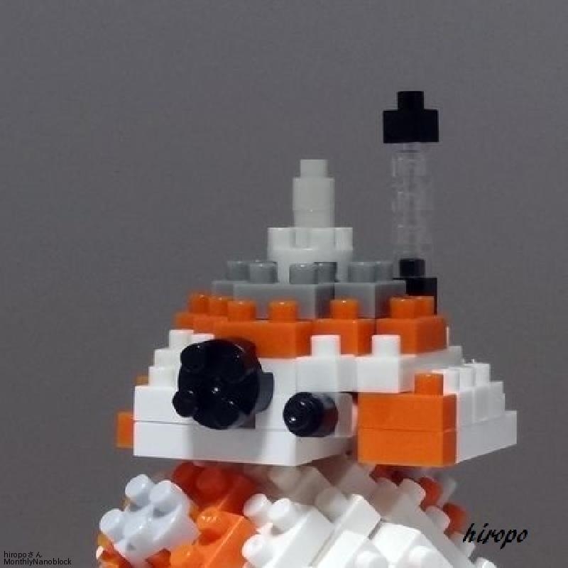 今回の新キャラでは最も人気ですね。頭部分はそれほど悩まず白とオレンジで作った半球形状にに黒の2×2丸ブロックと1丸を方向変換ブロックで取り付け、その他アンテナを2本付けました。体の部分は結構悩み、結局白とオレンジで土台を作って中央にグレーの2×2丸ブロックを積んだ面を6個作り、それを関節ブロックなどでさいころ状にすることで球体に近くしてみました。頭部分は分離しているので載せているだけです。