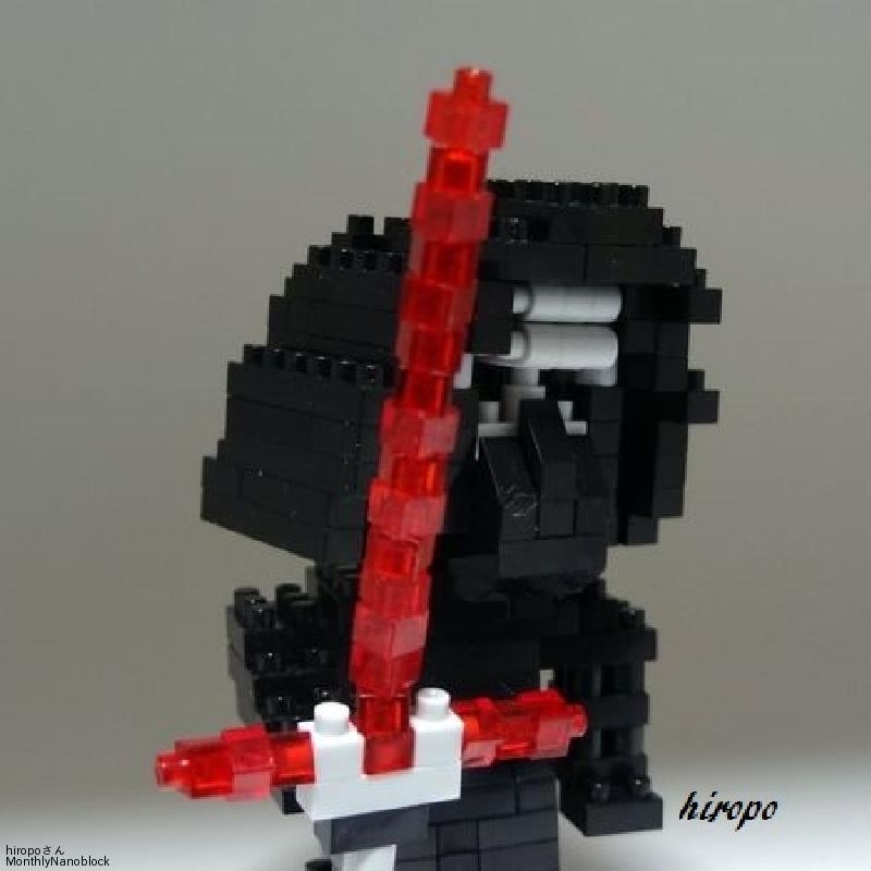 EP7での悪役キャラです。仮面の額部分の横縞は角丸ブロックを横に使って内部ではめ込んでいます。眼はあえて作らず凹まして表現、口付近はスロープブロックを使いました。赤い十字ライトセーバーは今までのライトセーバーに比較してギラギラしていたのでそれを表現するために丸ブロックではなく角ブロックを45度ずらして積みました。